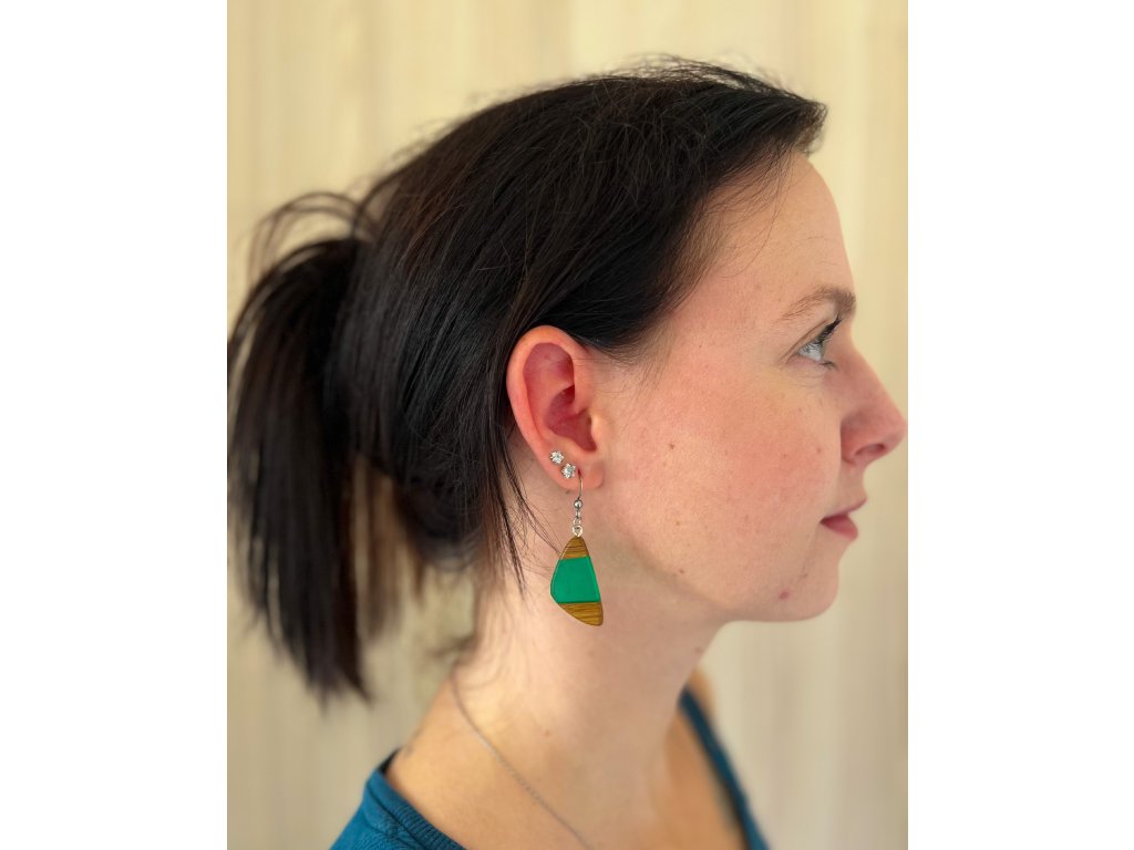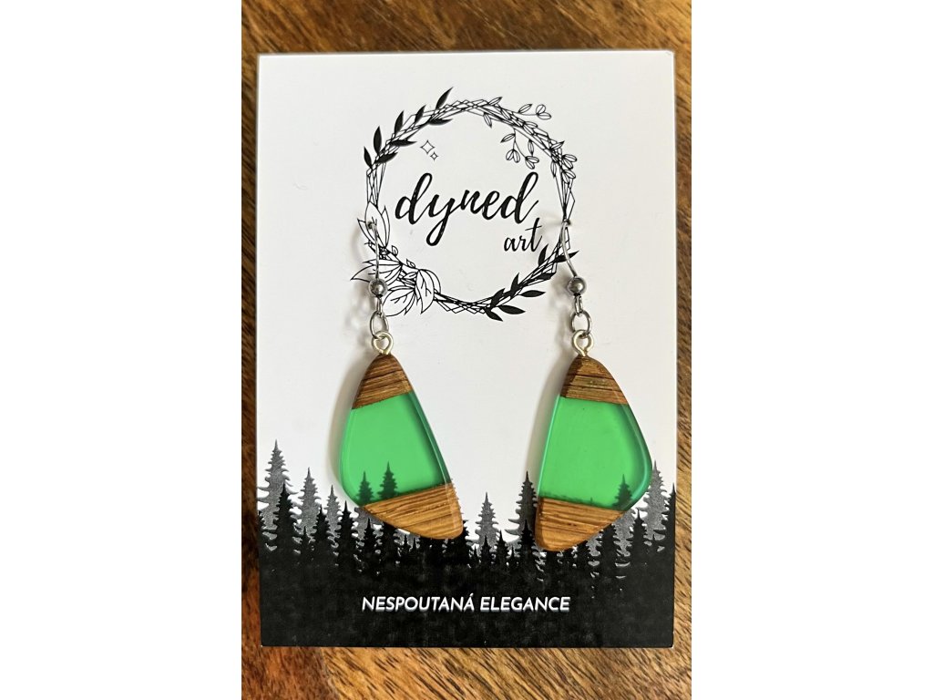 Lesní střípky – náušnice, které zachycují ducha lesa v jemných, zářivě zelených tónech. Kombinace dubového dřeva a transparentní zelené pryskyřice připomíná sluneční paprsky pronikající listím, tančící na lesní půdě. Tento jedinečný tvar a spojení materiálů vytváří šperk, který je hravý, svěží a přirozeně elegantní. Ideální pro milovníky přírody, kteří chtějí do svého stylu vnést kousek divokého lesa.